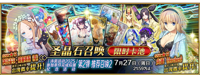 | 关联卡池 | 「泳装活动2025」参加条件完成应援纪念活动 第2弹推荐召唤 「泳装活动2025」参加条件完成应援纪念活动 第2弹推荐召唤3 |