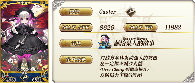 | 自身宝具威力提升15%&暴击威力提升15%&付与自身每回合获得3个暴击星的状态 | |||