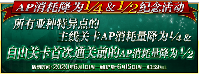 | 所有亚种特异点主线关卡的AP消耗减为1/4&自由关卡首次通关AP消耗减半活动 | |