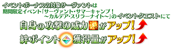 在本次活动期间,下表中的从者将在活动关卡中获得「自身攻击威力提升」与「牵绊点数获得量提升」的奖励!