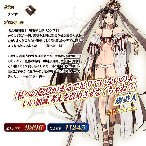 随着本活动主线关卡推进,活动限定奖励从者「★4(SR)虞美人(Lancer)」将限时加入。