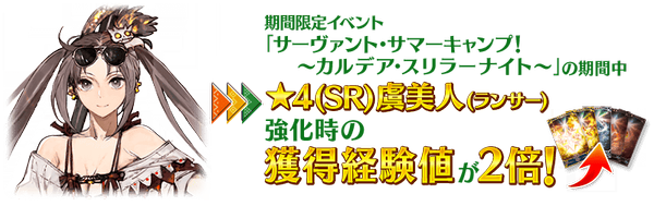 在本次活动期间,「★4(SR)虞美人(Lancer)」强化时获得的经验变为2倍。