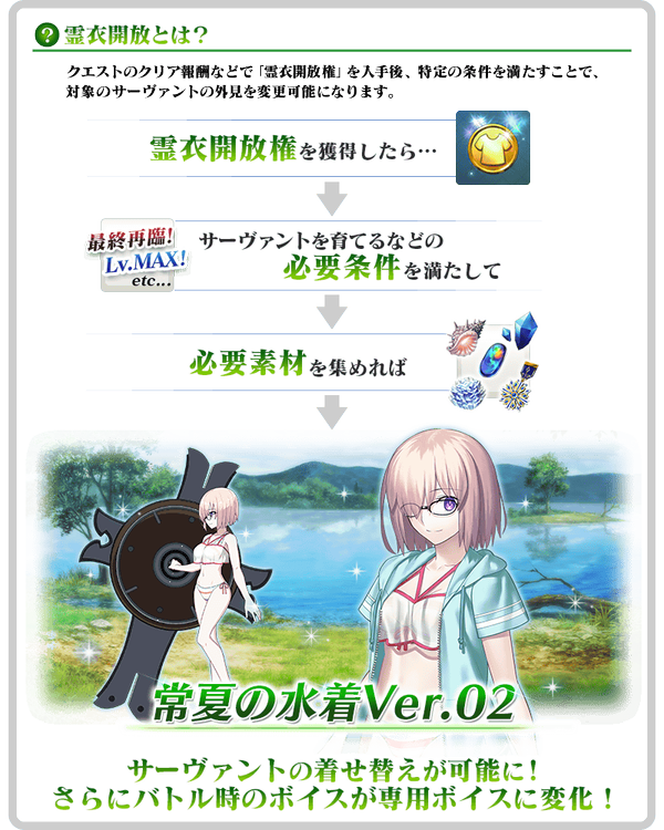 「★3(R)玛修·基列莱特」的灵衣「常夏的泳装Ver.02」需满足包括灵衣开放权在内的几项条件才可开放。