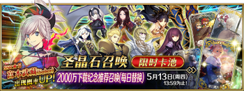 ※这是一次必定获得至少1骑 ★5(SSR)从者的十连召唤! ※仅可使用15个付费圣晶石进行召唤。无法使用免费圣晶石。 |