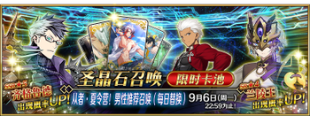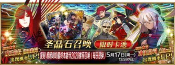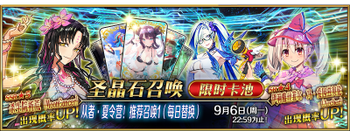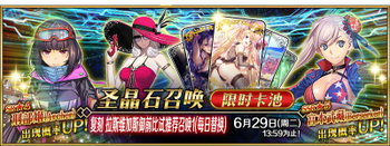 ※本卡池包括在2016年~2018年举办的夏日限时活动中实装的全体攻击宝具从者,以及常驻卡池下的所有全体攻击宝具从者(无概率UP) | ※在2016年~2018年举办的夏日限时活动中实装的所有概念礼装 | ||||||||