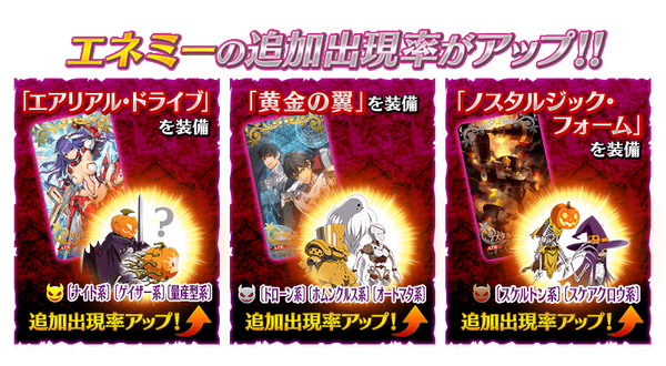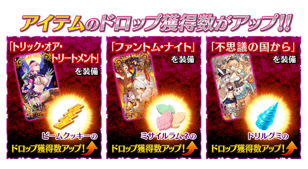 通过装备于圣晶石召唤中概率提升的活动限时概念礼装「不给治就捣蛋」「魅影之夜」「来自奇境」可分别提升限时活动「复刻:万圣节·强袭! 魔城攀登者/姬路城大决战 轻量版」专用道具「光线曲奇」「导弹苏打糖」「钻头橡皮糖」的掉落获得数量。