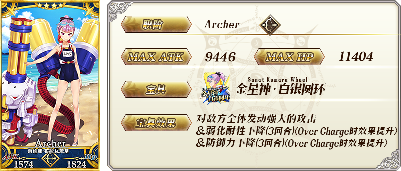 | 自身的Buster指令卡性能提升8%&宝具威力提升8%&防御力提升3%+「钛金属板」的掉落获得数增加2个【『复刻:难解难分·夏日锦标赛! 轻量版』活动期间限定】+「速食拉面」的掉落获得数增加2个【『复刻:死亡监狱·夏日大逃脱 轻量版』活动期间限定】 最大解放时, | |||