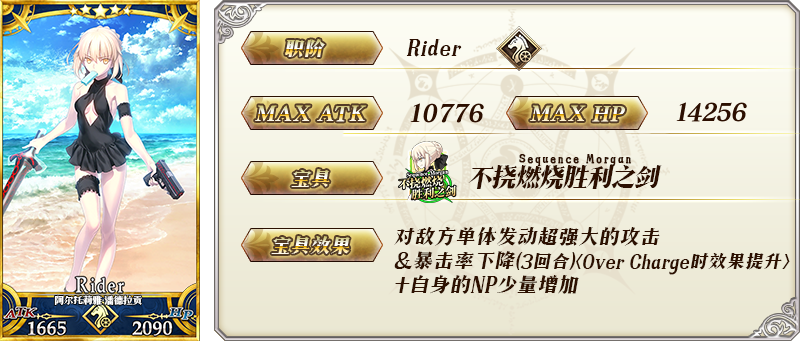 | 自身的Quick指令卡性能提升10%&暴击威力提升10%&付与自身每回合获得3个暴击星的状态+「镁合金车轮」的掉落获得数增加2个【『复刻:难解难分·夏日锦标赛! 轻量版』活动期间限定】+「康诺特币」的掉落获得数增加2个【『复刻:死亡监狱·夏日大逃脱 轻量版』活动期间限定】 最大解放时, | |||
