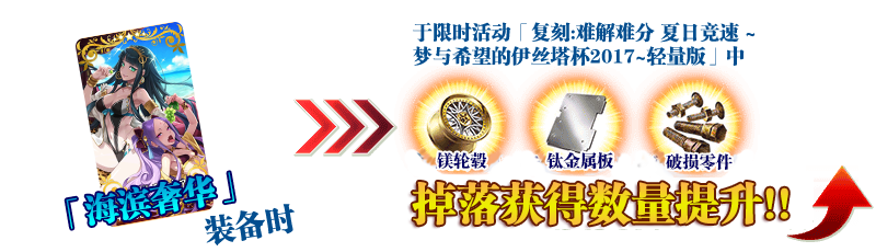 可提升限时活动「复刻:难解难分·夏日锦标赛! ~梦与希望的伊什塔尔杯2017~轻量版」专用道具「镁合金车轮」「钛金属板」「废旧零件」的掉落获得数量。