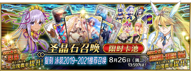 | 关联卡池 | BB主办☆名流夏日体验! 谜之代行者C.I.E.L推荐召唤 BB主办☆名流夏日体验! 迦尔纳推荐召唤 复刻 泳装2023推荐召唤 |