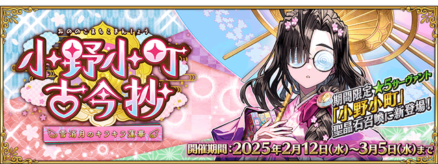 | 自身在『小野小町古今抄』中的攻击威力提升100%&关卡通关时获得的牵绊值提升50%【『小野小町古今抄』活动限定】 | 自身在『小野小町古今抄』中的攻击威力提升50%&关卡通关时获得的牵绊值提升20%【『小野小町古今抄』活动限定】 | 自身在『小野小町古今抄』中的攻击威力提升30%&关卡通关时获得的牵绊值提升20%【『小野小町古今抄』活动限定】 | ||||