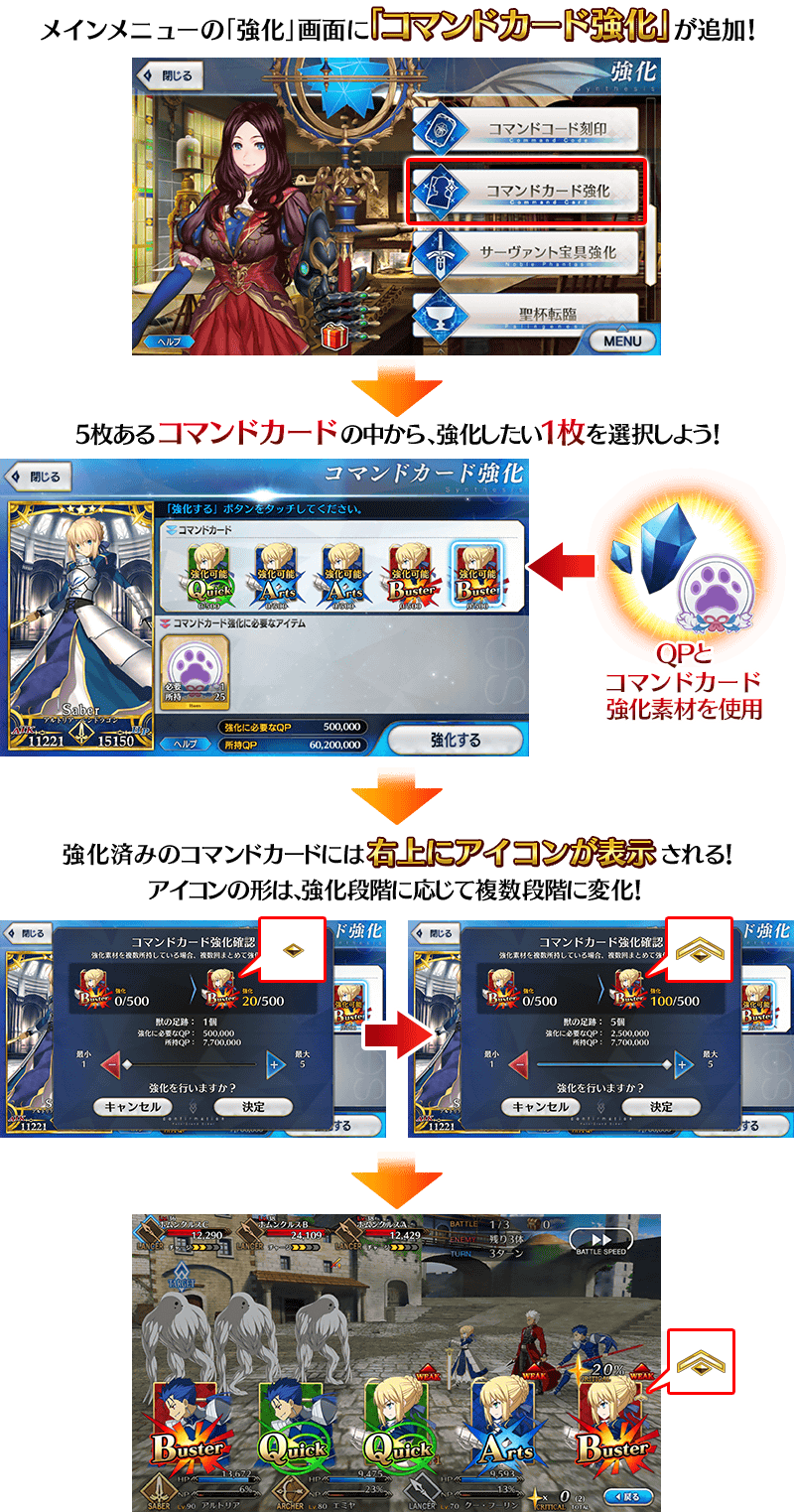 指令卡强化(コマンドカード強化)是对指令卡使用素材兽之足迹,来提升其「攻击力」的系统。