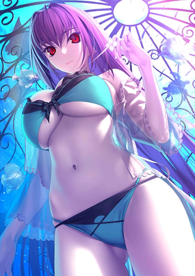 梅芙,怎么了?这就是我的泳装灵衣。梅芙?为什么一言不发僵住了……梅芙!?(持有女王梅芙(Saber)、女王梅芙) | |