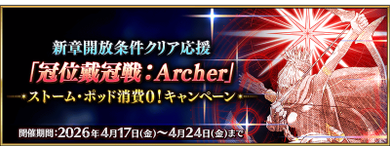 | 新章開放条件クリア応援「冠位戴冠戦:Archer」ストーム・ポッド消費0!キャンペーン | |