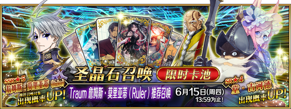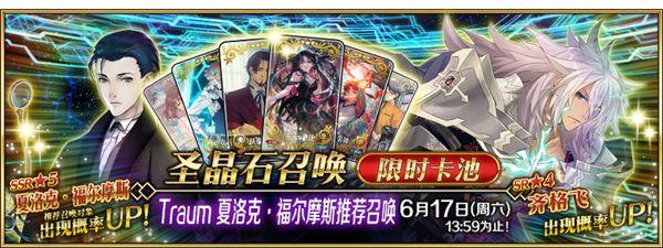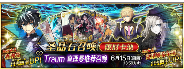 | 关联卡池 | Traum 查理曼推荐召唤 Traum 詹姆斯·莫里亚蒂(Ruler)推荐召唤 Traum 夏洛克·福尔摩斯推荐召唤 |