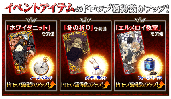 - 装备圣晶石召唤出的活动限定礼装「Whydunit」「冬日祈祷」「埃尔梅罗教室」,