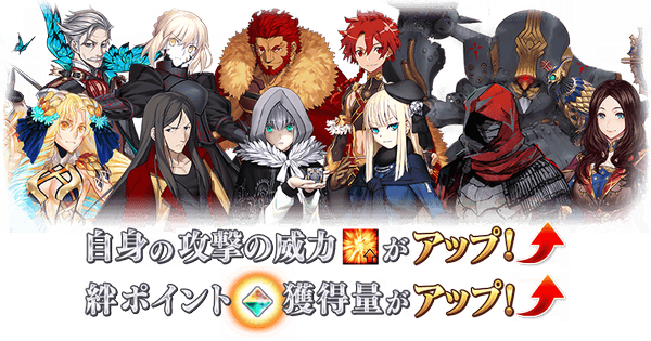 - 下列从者在活动中具备「自身攻击力提升」和「牵绊点数获得量提升」的加成。