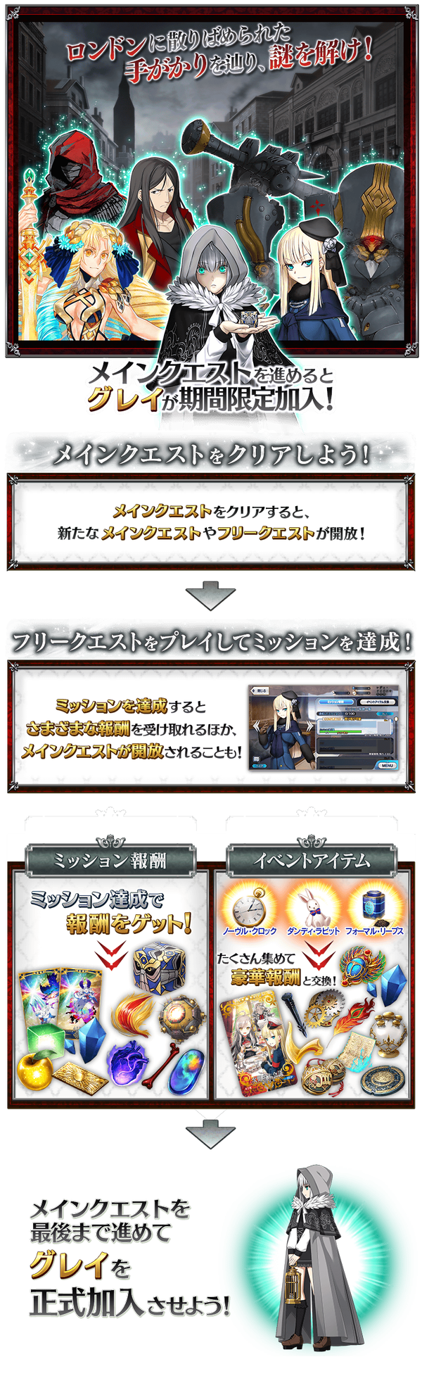 - 伴随着主线关卡的进行,活动限定从者「★4(SR)格蕾」也会在期间限定加入。