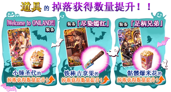通过装备于圣晶石召唤中概率提升的活动限时概念礼装「Welcome to ONILAND!!」「遍染艳红」「足柄兄弟」可分别提升本次活动专用道具「小槌圣代」「吉拿鬼金棒」「骷髅爆米花」的掉落获得数量。