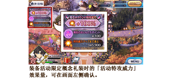 随着剧情的推进,当前的「攻击威力提升」效果和下次威力提升所必需的点数,会显示在地图界面和活动奖励界面的左侧。