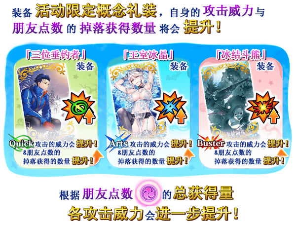 在本次活动中,装备在活动道具兑换及友谊点数达成奖励中可获得的活动限定概念礼装「三位垂钓者」「皇家糖霜」「冰结斗熊」,将会提升各概念礼装对应种类的指令卡攻击威力和友谊点数的掉落获得数。