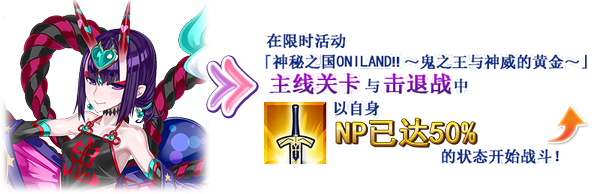 仅在限时活动「神秘之国的ONILAND!! ~鬼王与神威的黄金~」的部分关卡中,「★4(SR)酒吞童子(Caster)」追加特殊效果!
