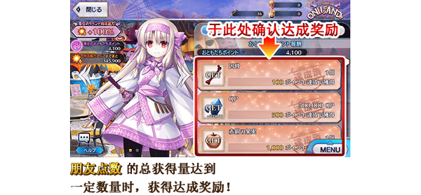 友谊点数的总获得量每到达一定数量,即可获得达成奖励。
