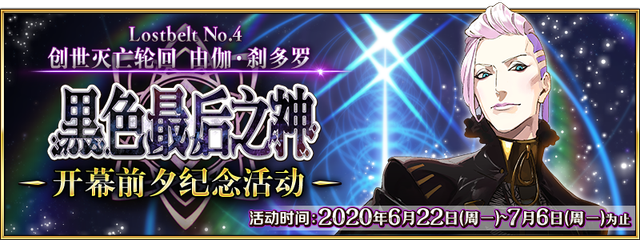 | 关联卡池 | 「Lostbelt No.4 创世灭亡轮回 由伽·刹多罗 黑色最后之神」开幕前夕推荐召唤 |