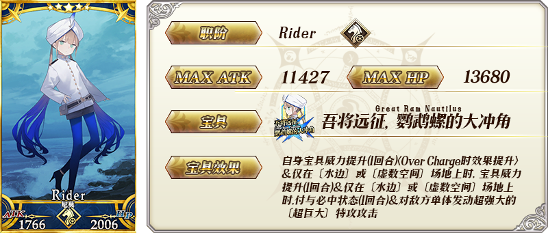 自身的Arts指令卡性能提升8%&Buster指令卡性能提升8%&暴击威力提升8%&以NP已达40%的状态开始战斗 | |||