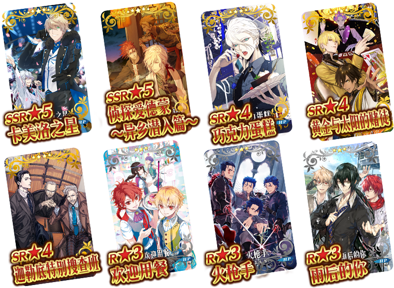同时“男性精选”主题的概念礼装「★5(SSR)卡美洛之星」「★5(SSR)侦探爱德蒙~异乡潜入篇~」「★4(SR)巧克力蛋糕」「★4(SR)黄金与太阳的赌徒」「★4(SR)迦勒底特别搜查班」「★3(R)欢迎用餐」「★3(R)火枪手」「★3(R)雨后的你」也将限时登场。