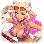 御主想要吃什么~?西瓜? 冰淇淋? 刨冰? 在海滩吃的话,炒面也是经典吧~。……哎~。肯定会兴奋啦,毕竟好不容易才成为泳装灵基嘛!啊,不要紧,如果只是些微的变化,我是可以靠技能调整体型的,没问题。哼哼~很狡猾吧?那么,要不要再来点……波子汽水和法兰克福肠? | |