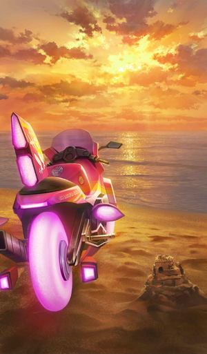 我将以前乘着到处跑的光轮车改装成超级运动跑车风格了。……御主,要不要两个人一起骑? 要不要一起感受风?其实呀其实呀~,我也打算和你两人骑,所以已经准备后座座椅啦♪ 否则独自享受未免太浪费了嘛。来嘛来嘛♪ 要抱紧我的腰哦。让您见识一下Rider职阶特有的极限猛攻安全驾驶!好好享受我引以为傲的神通力力场吧! | |