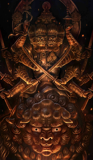 传说中景虎信奉的手持八把宝剑脚跨狮子的异形毗沙门天像。