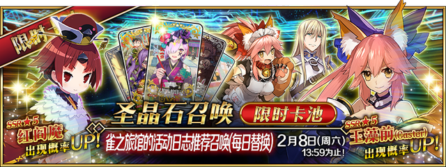 「★5(SSR) 红阎魔」、「★5(SSR) 玉藻前(Caster)」、「★4(SR) 芬恩·麦克库尔」、「★4(SR) 玉藻猫」将以每日替换的形式参与推荐召唤。