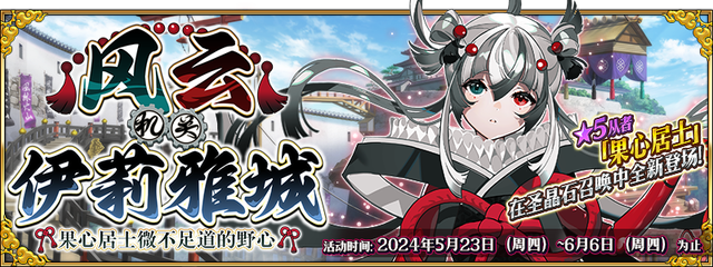| 关联卡池 | 风云机关伊莉雅城 果心居士推荐召唤 风云机关伊莉雅城 伊莉雅丝菲尔·冯·爱因兹贝伦(Caster)推荐召唤 风云机关伊莉雅城 志度内推荐召唤 复刻「尼禄祭&BATTLE IN NEWYORK 推荐召唤」卡池 |