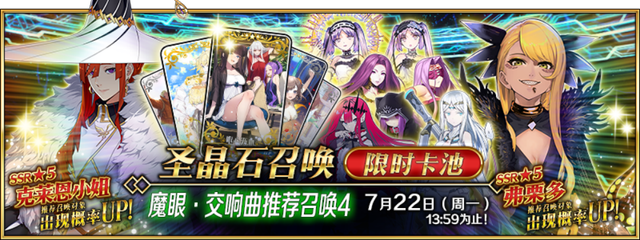 | 关联卡池 | 魔眼·交响曲 美杜莎(Saber)推荐召唤 魔眼·交响曲 曲亭马琴推荐召唤 魔眼·交响曲 呼延灼推荐召唤 |