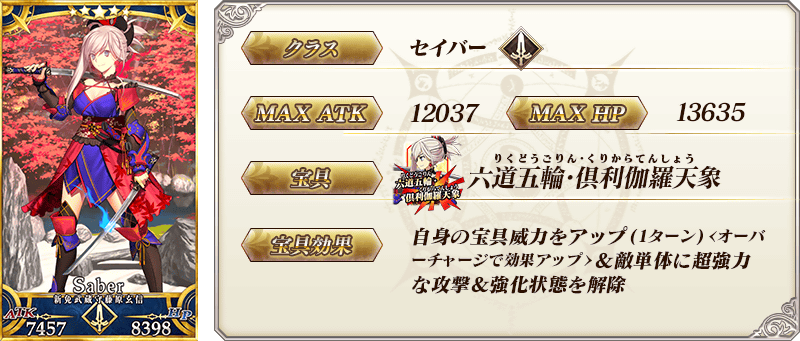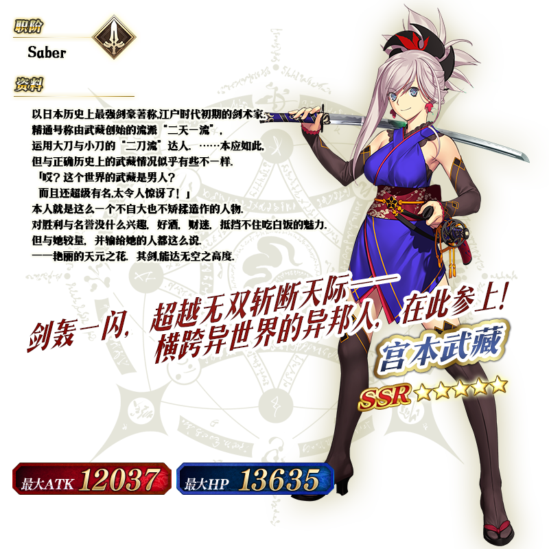 ※以上的「★5(SSR)宫本武藏(Saber)」的圣肖像为灵基再临第2阶段。