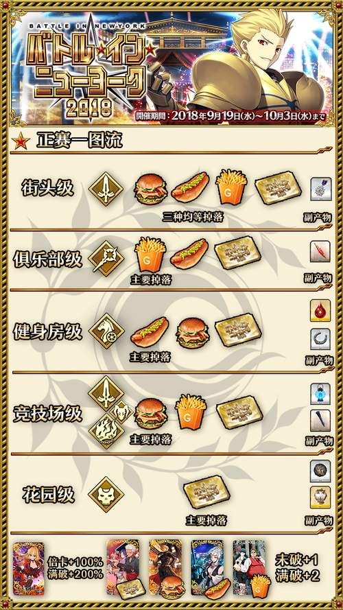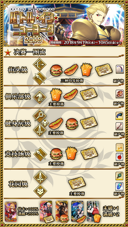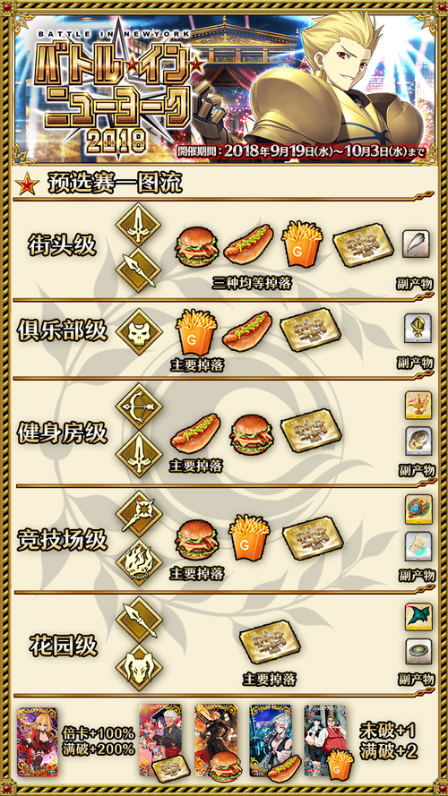 | 大会关卡 | 敌方职阶 | 掉落活动道具 | 掉落素材 | 主掉落加成礼装 |