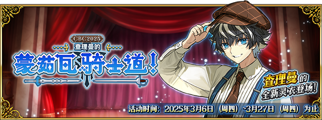 | 关联卡池 | CBC2025 蒙茹瓦骑士道! 查理曼推荐召唤 CBC2025 蒙茹瓦骑士道! 阿斯托尔福(Saber)推荐召唤 CBC2025 推荐召唤 白色情人节回忆推荐召唤 |
