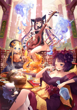 于是每当有画师绘制了阿比盖尔、葛饰北斋和杨贵妃在一起的作品。就会有人质疑为何没有XX毛,于是“XX小姐在来的路上”一梗应运而生。如下图: