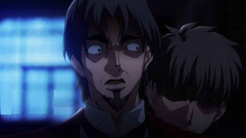 这个场景首次出现是在Fate/Zero动画中,是言峰绮礼在吉尔伽美什的言语诱惑下决心复归战争,追寻“愉悦”,随即联合吉尔伽美什偷袭了远坂时臣的场景。