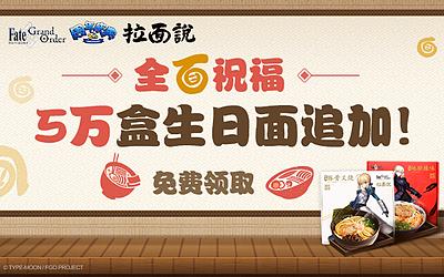 为庆祝《FGO》国服4周年,Bilibili官方将在2020年8月25日23:59前,在参与抽奖的于2020年8月20日23:59前御主等级达到130级的FGO国服B服玩家中,通过抽取方式赠送45600份拉面说合作定制生日拉面。本次有以藤丸立香(女)作为包装封面的番茄豚骨叉烧拉面和以藤丸立香(男)作为包装封面的日式豚骨叉烧拉面两种口味。