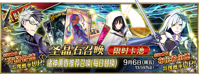 ※「诸神黄昏推荐召唤(每日替换)」为每日替换卡池,所以在推荐召唤期间,并非每天都可召唤「★5(SSR) 齐格鲁德」,敬请注意。