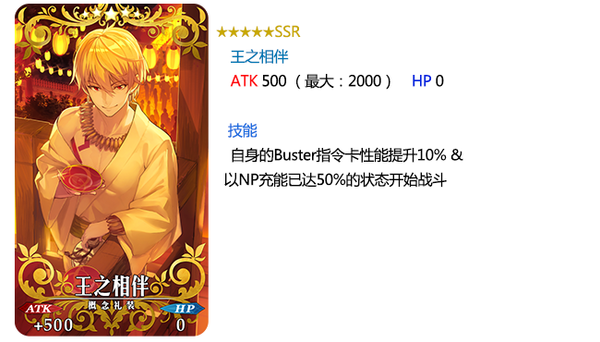 | 自身的Buster指令卡性能提升10%&暴击威力提升10%&以NP已达40%的状态开始战斗 + | |||