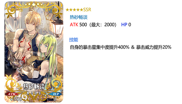 此外,目前已经登场的限定概念礼装「★5(SSR)舍华求实」、「★5(SSR)王之相伴」、「★5(SSR)热砂畅谈」、「★5(SSR)盛夏一刻」、「★5(SSR)繁星之夜」、「★5(SSR)苦味甜蜜」将以每日替换的形式参与推荐召唤!
